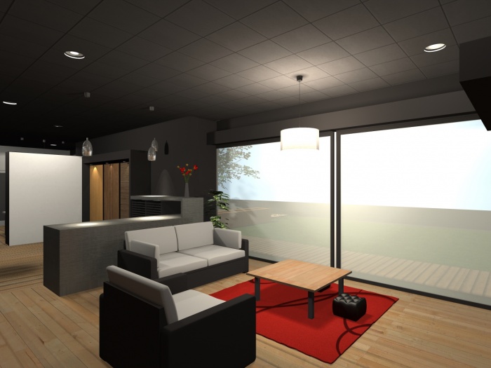 Le show room est traité quant à lui dans un esprit chaleureux et « cosy », donnant priorité à la mise en valeur des produits. L’objectif est de permettre aux clients de se projeter dans leur intérieur et non pas d’avoir une abondance d’échantillons peu représentatifs. Les parquets sont donc présentés en dimensions de 60cm par 2m de hauteur sous un éclairage adapté donnant un rendu réaliste.