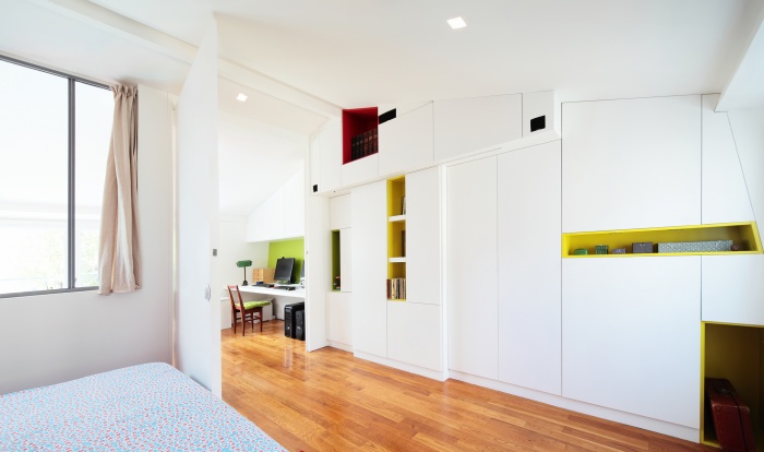 Par ailleurs, l'enjeu de ce coin bureau consistait à être utilisé la journée sans laisser entrevoir le coin nuit. Le lit est intégralement caché par une grande porte sur pivot. La porte peut donc rester ouverte afin de bénéficier d'un espace de travail traversant.