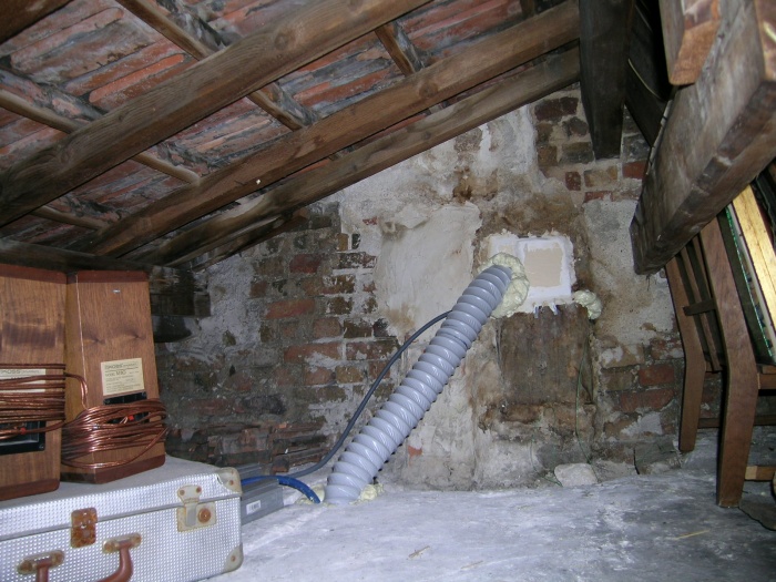 Chantier. Vue de la surélévation en construction et dépose de l'ancienne charpente.